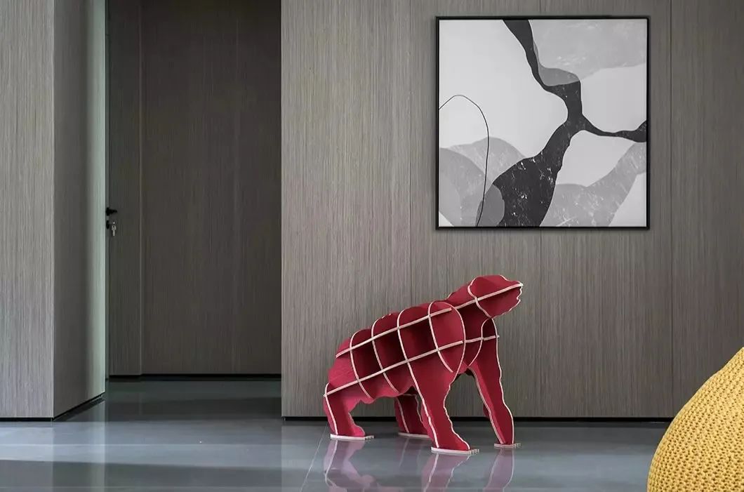 ▲休闲区的墙面以木饰面的空间为主,布置红色时尚的拼接造型的动物摆饰,搭配现代简洁的黑白调装饰画,营造出优雅高档的大气感。