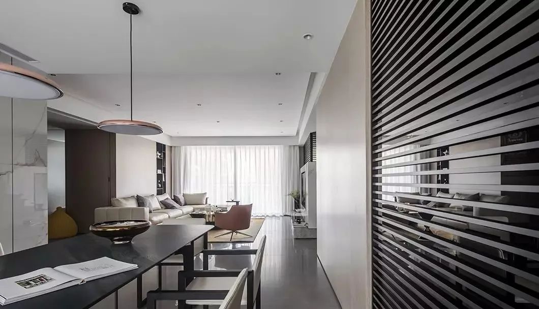 ▲餐桌上简约现代的摆饰品,与托盘造型的玫瑰金色吊灯搭配,拉起纱帘后,整个客餐厅氛围显得明亮舒适而自然惬意。