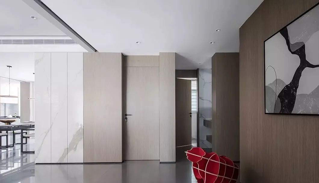▲在侧边墙面加入木饰面,床头墙也是灰色的硬包为背景,搭配灰色皮艺床,布置简约素雅的床单,精致成熟的床头柜摆饰,也让卧室显得更加优雅高级。